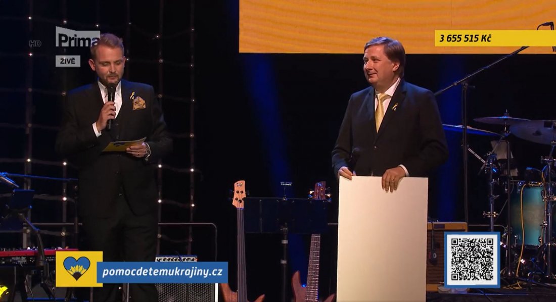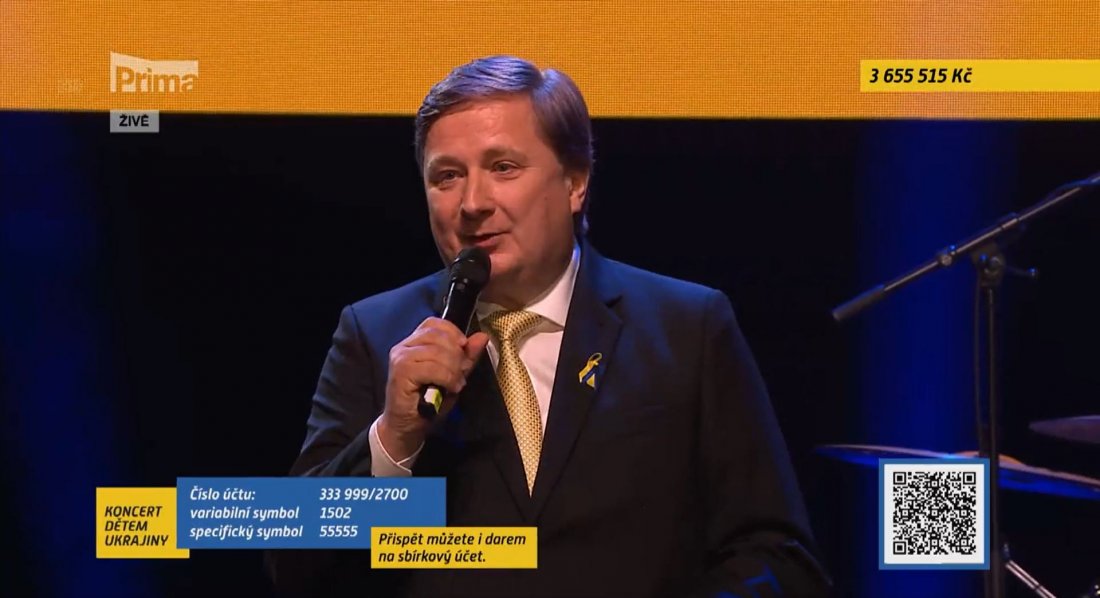 Radomír Lapčík: „Založil jsem Trinity Bank, aby byl svět lepší. A právě dneska je potřeba pomáhat nejvíc v životě. Chci poděkovat všem Čechům, protože jste nejlepší na světě. Vždycky když je nějaký malér Češi jako první přijdou, pomůžou, pošlou prostředky, takže v tom jste úžasní. Chci vám všem moc poděkovat.