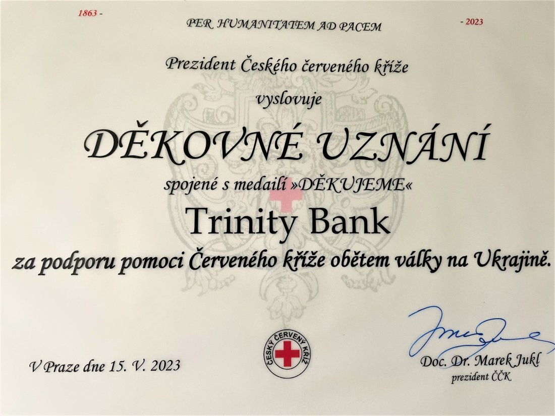 Prezident Českého červeného kříže (ČČK) Marek Jukl předal Trinity Bank, při příležitosti oslav dne Červeného kříže, medaili „Děkujeme“ za podporu banky v rámci pomoci Červeného kříže obětem války na Ukrajině.