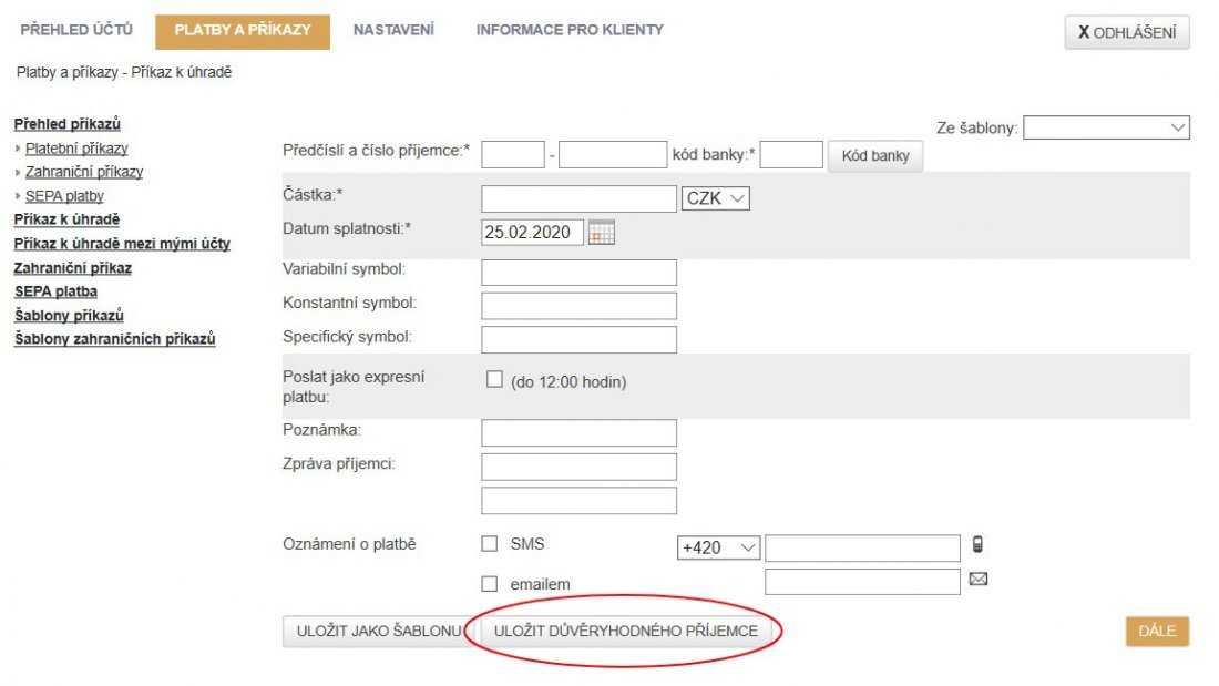 Do internetového bankovnictví přidáváme možnost nastavení důvěryhodných příjemců. Platby prováděné na takto označené účty již nebude nutné opětovně autorizovat ani při vyšších částkách. Možnost nastavení důvěryhodného účtu naleznete při vyplňování převodního příkazu ve spodní části obrazovky.