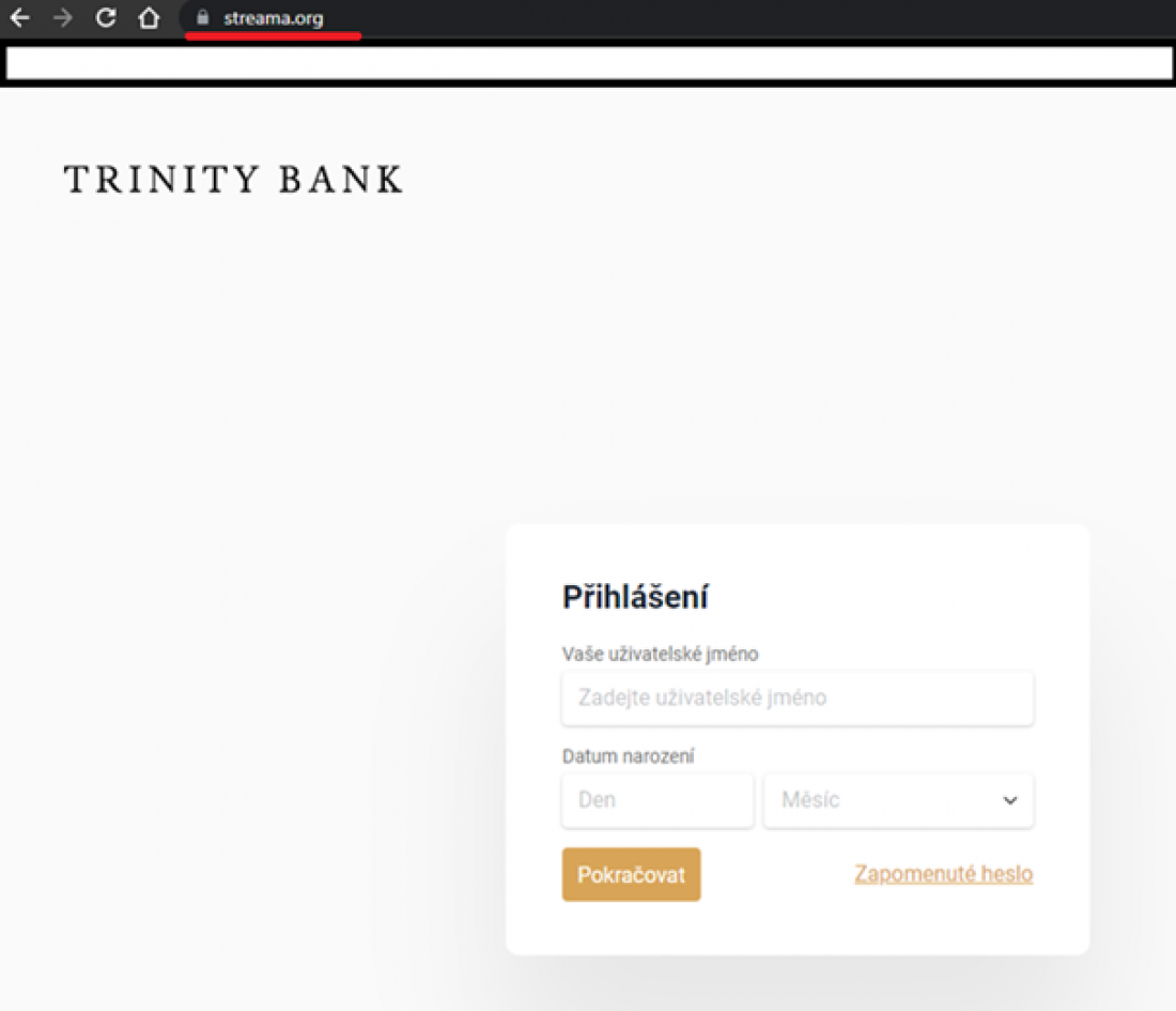 Chtěli bychom Vás upozornit na aktuální hrozbu, která se týká podvodných stránek imitující internetové bankovnictví TRINITY BANK. Tzv. phishingová stránka se tváří jako legitimní bankovnictví, které ovšem sbírá informace a klientovi. Přihlašovací údaje jsou následně podvodníkem zadávány do skutečného bankovnictví TRINITY BANK. Následně jsou zadávány platební příkazy pro přenos finančních prostředků na cizí bankovní účet.